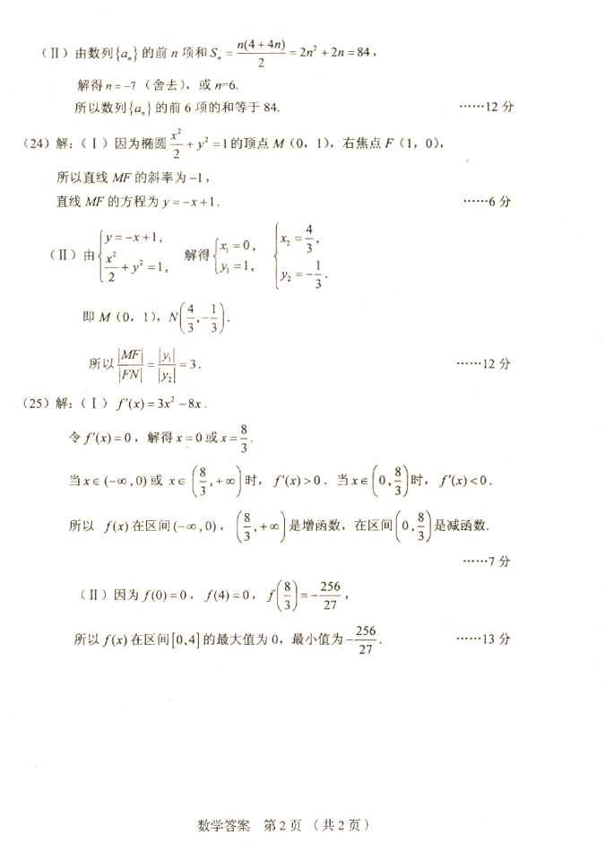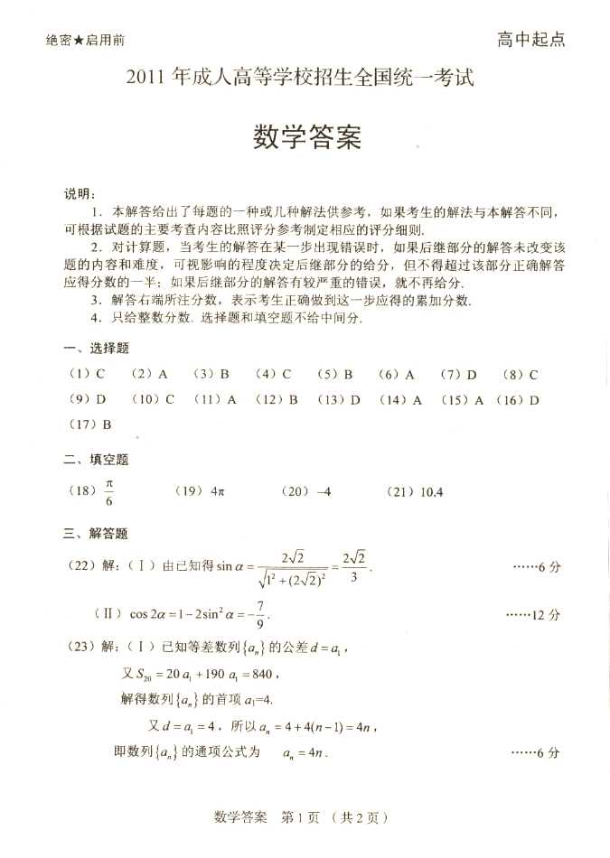 2011年全国成人高考高起点《数学》试题及答案