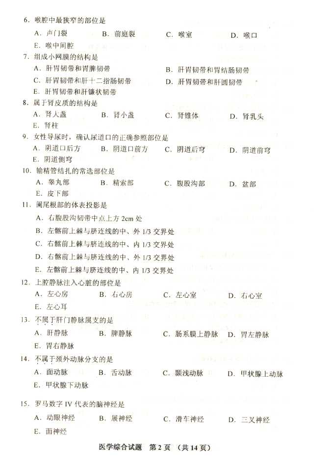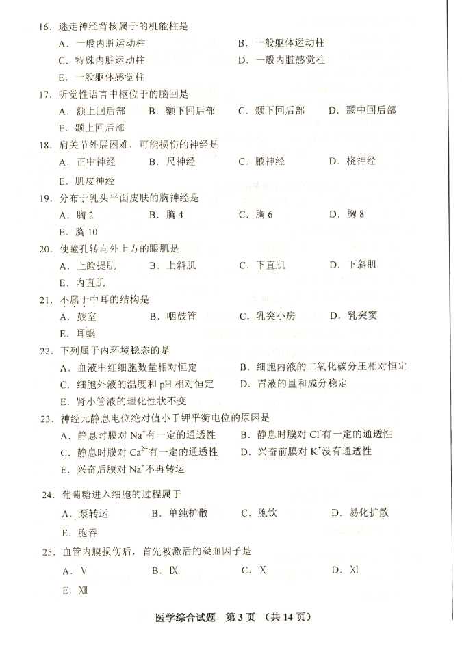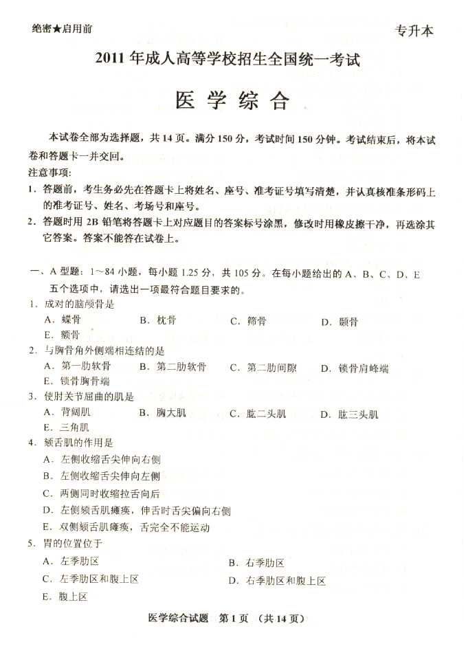 2011年全国成人高考专升本《医学综合》试题及答案