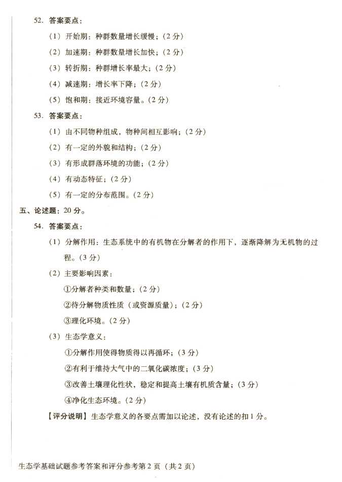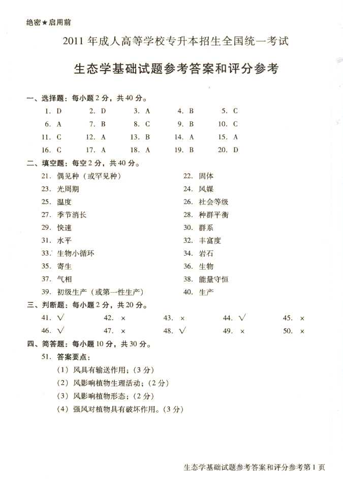 2011年全国成人高考专升本《生态学基础》试题及答案