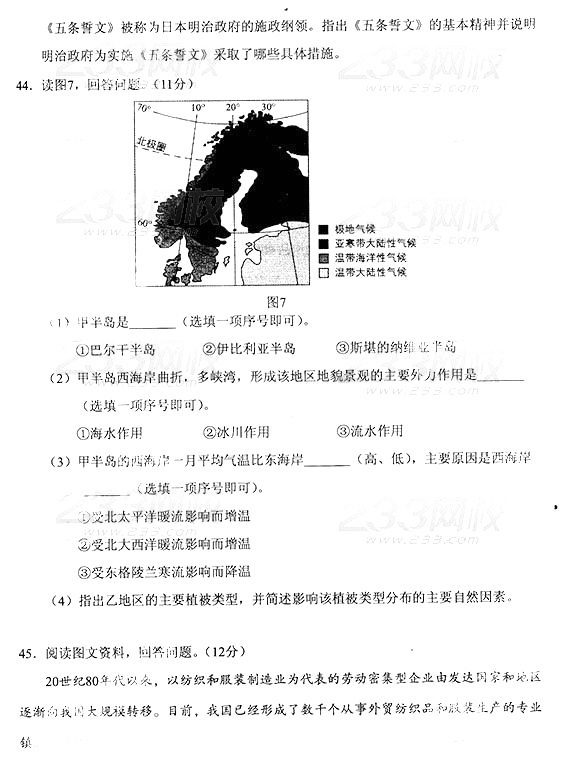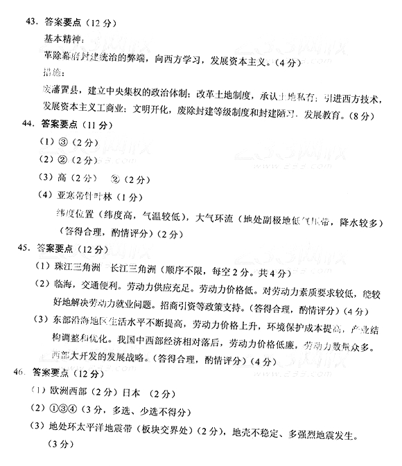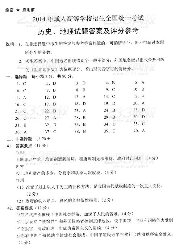 2014年成人高考高中起点《历史地理》真题及答案