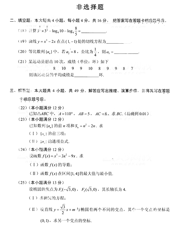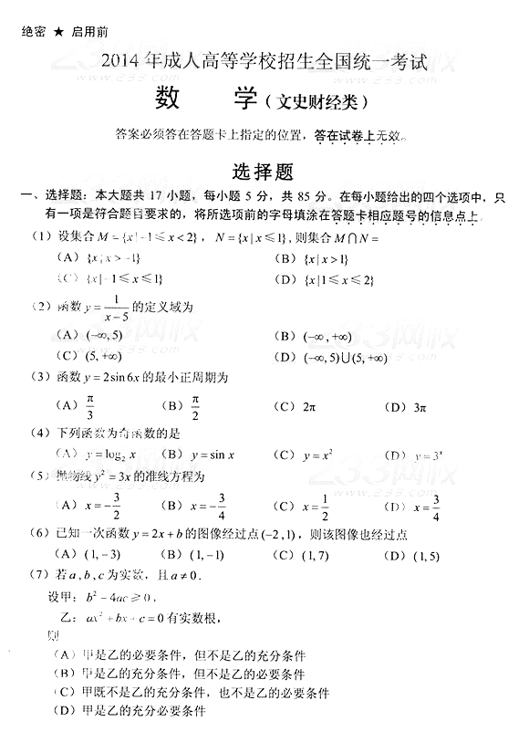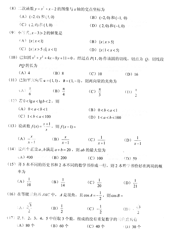 2014年成人高考高中起点《数学》(文史)真题及答案