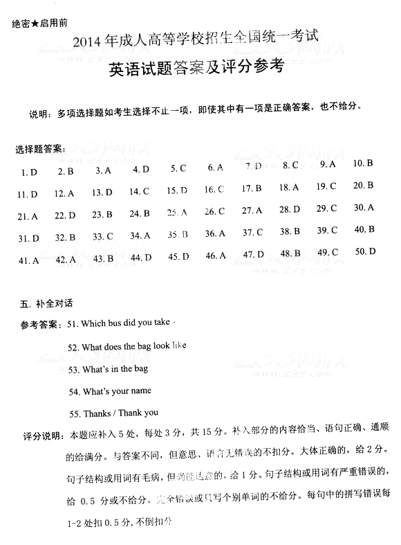 2014年成人高考高中起点《英语》真题及答案