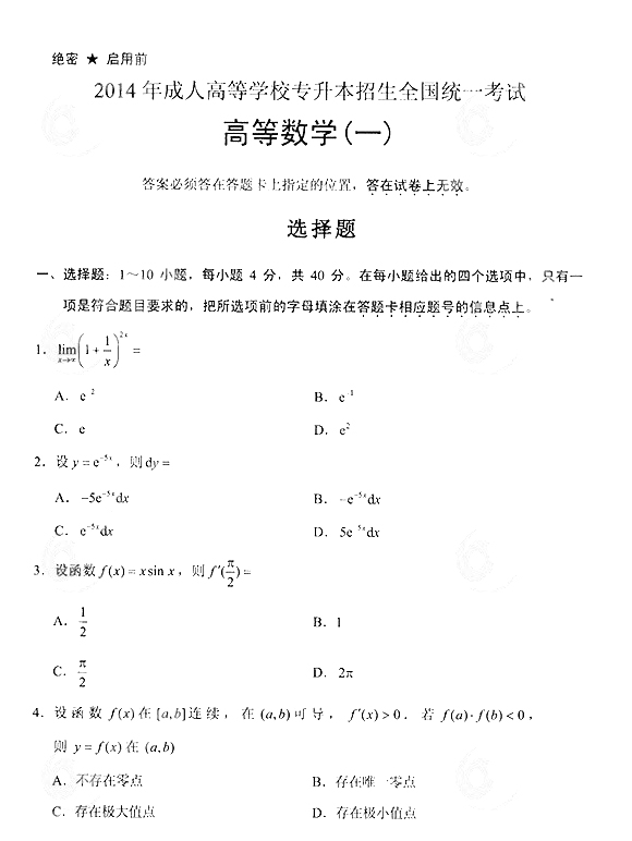2014年成人高考专升本《高等数学(一)》真题及答案