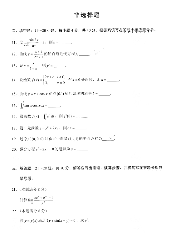 2014年成人高考专升本《高等数学(二)》真题及答案