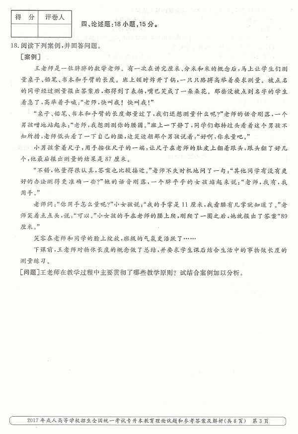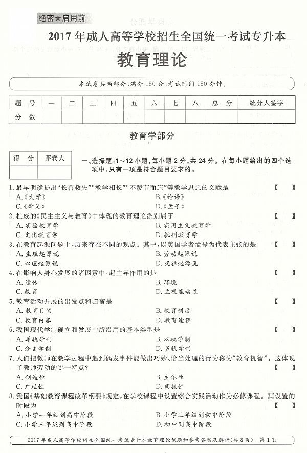 2017年成人高考专升本《教育理论》真题及答案