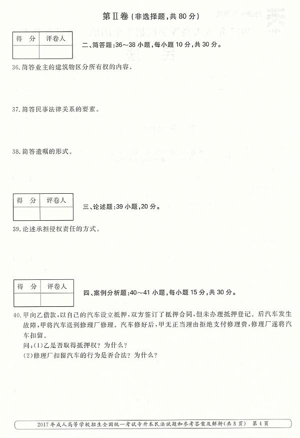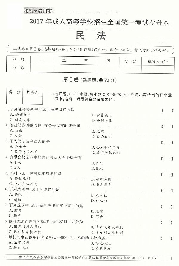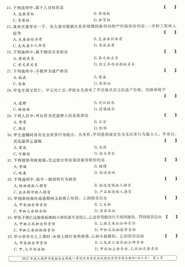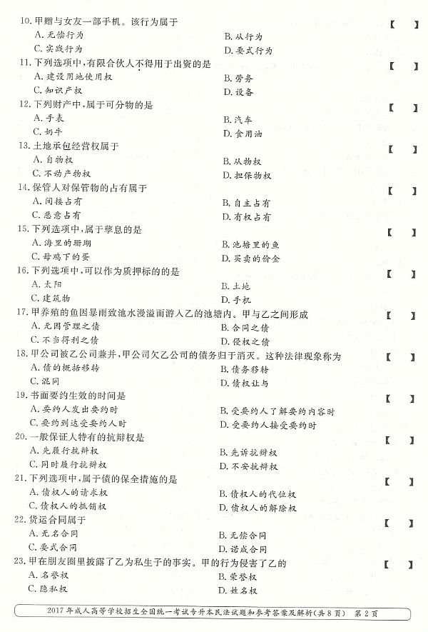 2017年成人高考专升本《民法》真题及答案