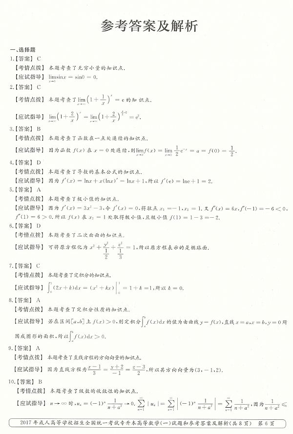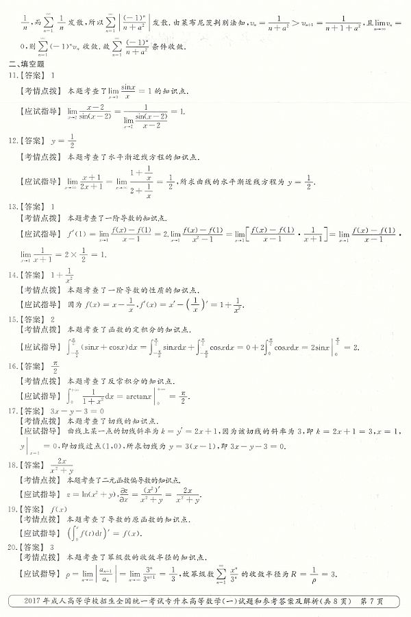 2017年成人高考专升本《高等数学(一)》真题及答案
