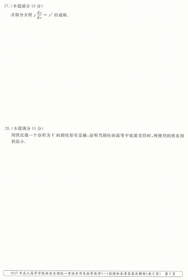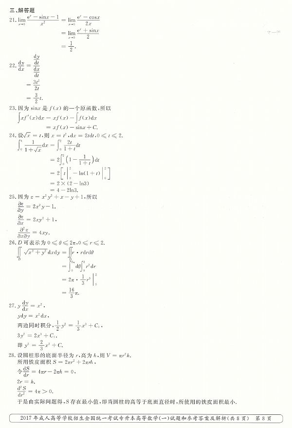2017年成人高考专升本《高等数学(二)》真题及答案