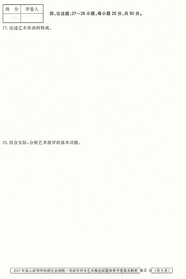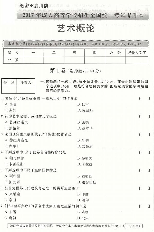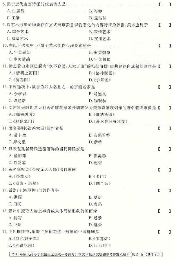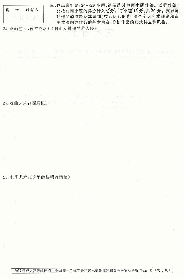 2017年成人高考专升本《艺术概论》真题及答案
