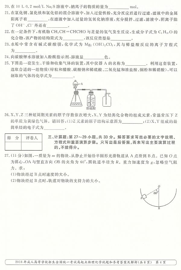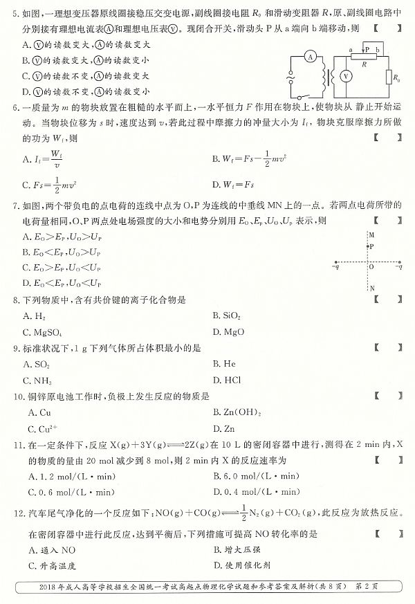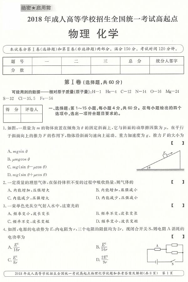 2018年成人高考高起点《物理化学综合》真题及答案