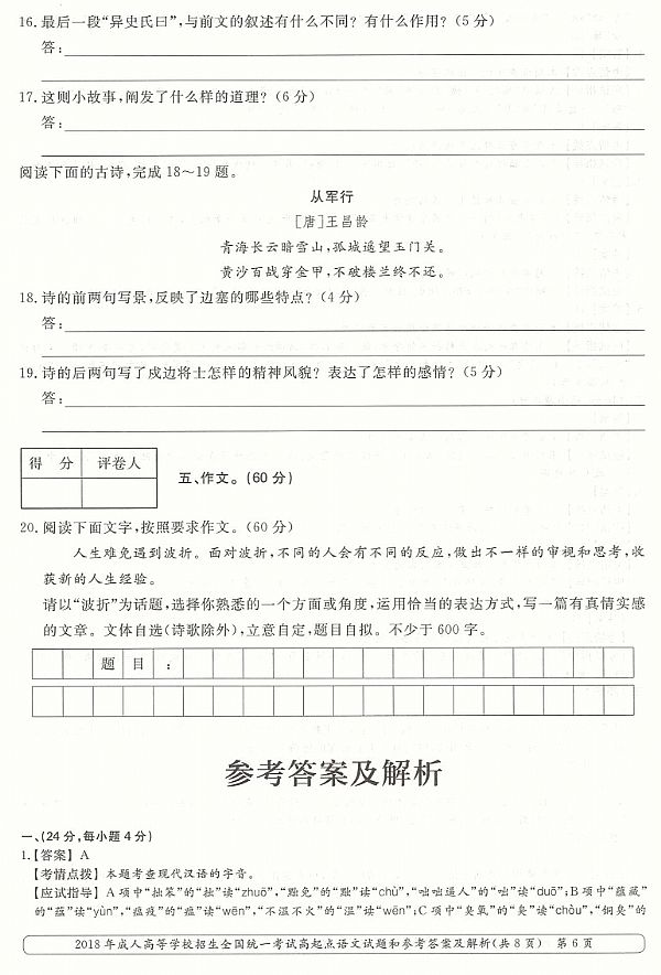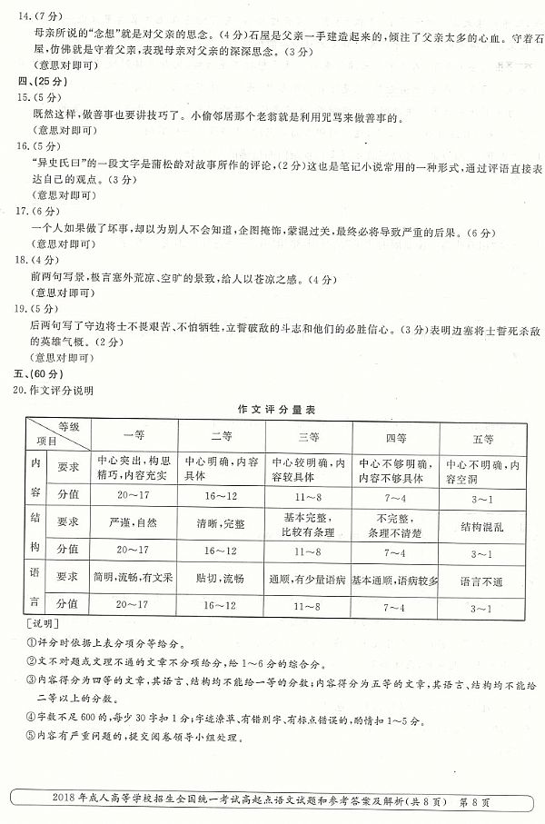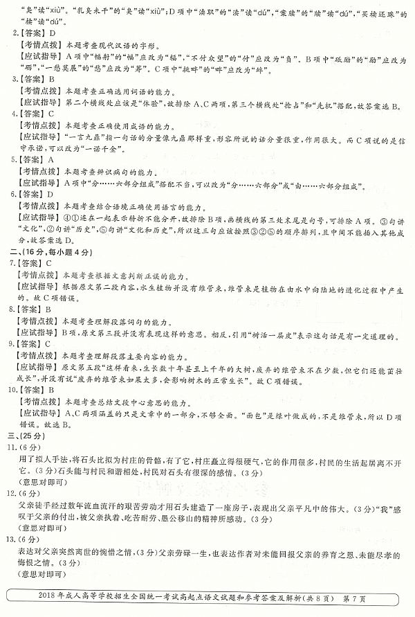 2018年成人高考高起点《语文》真题及答案