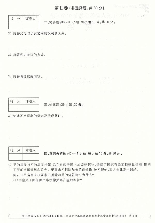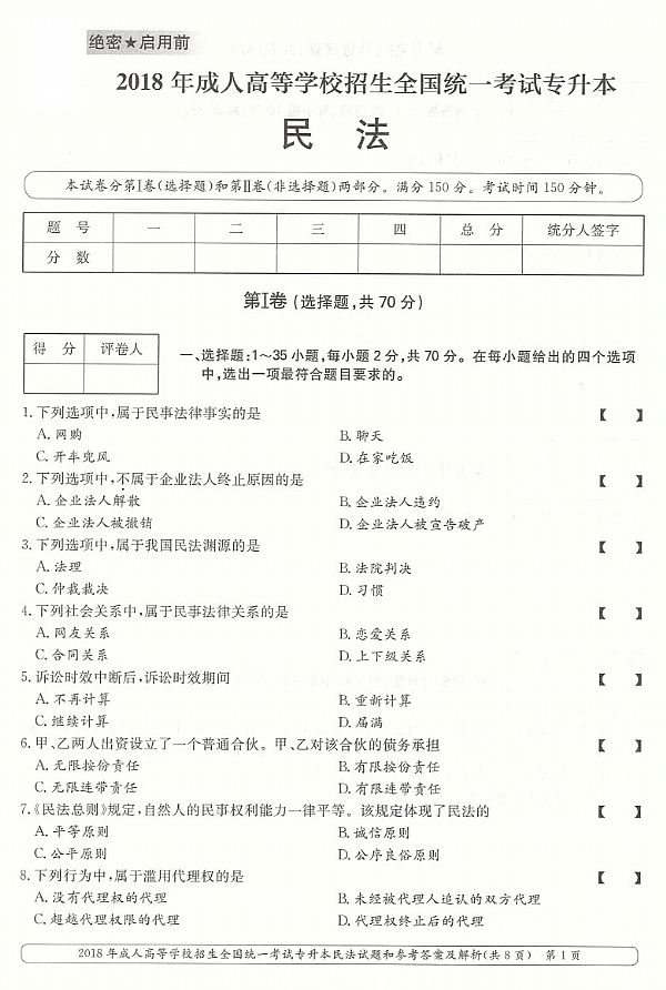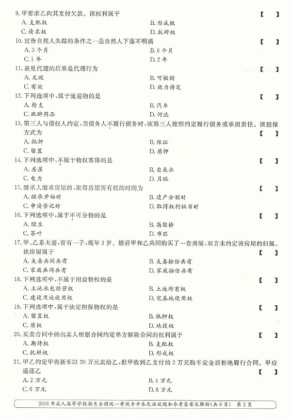 2018年成人高考专升本《民法》真题及答案